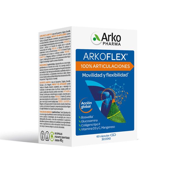 Arkoflex® 100% Articulaciones permite un cuidado integral de las articulaciones, huesos, cartílagos, ligamentos, tendones y músculos, ayudando a mantener el bienestar articular y aliviar el dolor crónico.\r\n\r\nSu fórmula actúa a varios niveles:\r\n\r\n- Cartílagos: la Vitamina C participa en la formación de colágeno para un adecuado funcionamiento del cartílago.\r\n\r\n- Músculos: la Vitamina D3 contribuye al mantenimiento normal de la función muscular.\r\n\r\n- Huesos: la Vitamina D3 ayuda al mantenimiento de los huesos en condiciones normales.\r\n\r\n- Tendones y Ligamentos: el Manganeso contribuye a la formación normal del tejido conectivo.\r\n\r\nSu completa fórmula contiene además un extracto de Boswellia, altamente concentrado, que ayuda al mantenimiento normal de la flexibilidad y del bienestar articular; y Glucosamina, constituyente esencial del cartílago y Colágeno hidrolizado tipo II específico para las articulaciones.