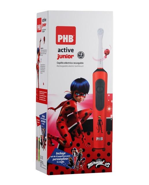 El cepillo PHB Active Junior gracias a sus 5.600rpm de su cabezal rotacional proporciona mayor eficacia en la eliminación de la placa bacteriana, especialmente en los espacios interdentales y superficie interior de los dientes. Sus filamentos de Tynex redondeados garantizan un cepillado suave y agradable. Incluye un set de pegatinas para que los peques puedan personalizar su cepillo con sus personajes favoritos. Cabezal intercambiable de dureza suave. Duración de la batería 5 días (2 lavados por día). Base con cargador 220-240V 50Hz 2W.