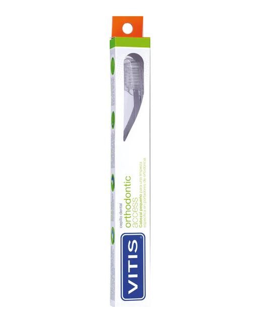 Indicaciones. Niños y adultos portadores de aparatos de ortodoncia (bandas localizadas en las molares, arcos, brackets, resortes, ligaduras, etc.). Descripción. Cepillo de uso diario para aparatos de ortodoncia sólo para adultos. Cabezal pequeño que permite acceder a las zonas de difícil acceso (zonas posteriores de la boca, especialmente piezas que se encuentran en proceso eruptivo, malposición dentaria, etc.). Filamentos suaves y medios, perfil en forma de V que permite hacer un doble efecto de limpieza (aparatos de ortodoncia y encías). Cuello maleable que permite su flexión hasta adquirir la posición del cepillo que mejor se adapta a la cavidad bucal, facilitando la accesibilidad durante el cepillado. Mango anatómico y con estrías antideslizamiento para facilitar su uso. Capuchón protector, mantiene los filamentos agrupados y en condiciones óptimas de higiene. 6 Colores: transparente, verde, azul, rojo, amarillo y lila.